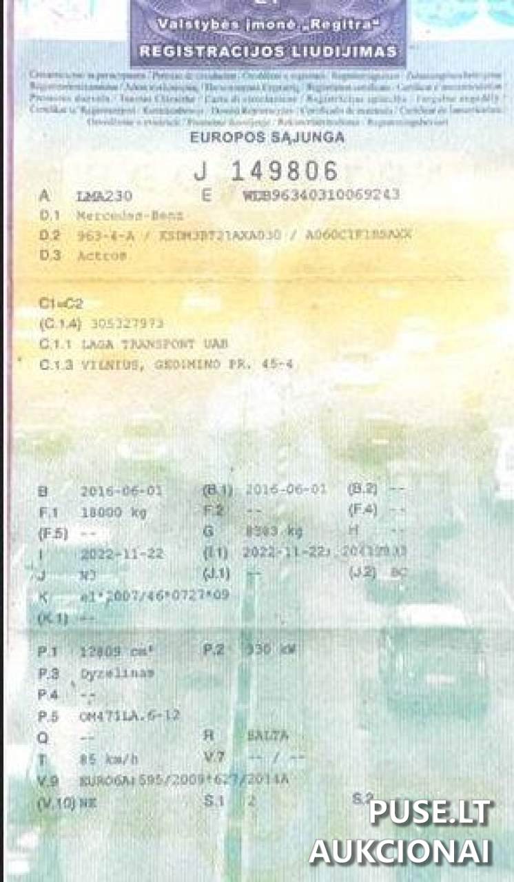 Продается подержанный грузовой автомобиль Mercedes Benz Actros, относящийся к тяжелому транспорту (свыше 12 т.). Автомобиль участвует в аукционе в рамках процедуры банкротства, которую администрирует управляющий по неплатежеспособности. Состояние автомобиля хорошее. Год выпуска – 2016. Мощность двигателя 330 кВт, рабочий объем 12809 см3. Пробег составляет 1 265 333 км. Объект является плательщиком НДС, регистрационные данные указаны уникальным номером WDB96340310069243. Покупателю следует иметь в виду, что данное имущество находится в залоге.
