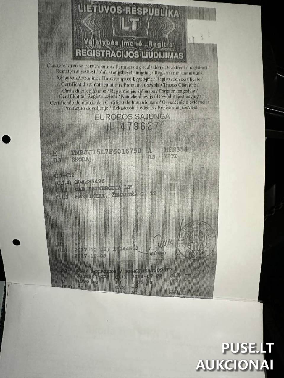 Продається вживаний легковий автомобіль Skoda Yeti другої категорії. Початкова ціна на аукціоні становить 4704 EUR. Торги проводяться на підставі аукціону адміністратора неплатоспроможності. Унікальний код активу (ID): 85448, номер реєстрації: HFN354. Автомобіль не є об'єктом ПДВ. Стан оцінюється як «вживаний».\n\nАукціон розпочнеться 2026-03-16 09:06:22 і завершиться 2026-04-15 09:06:59. Важливо: зазначено, що актив перебуває у заставі, що є умовою для придбання.\n\nОгляд майна організовано у Вільнюсі. Продаж адмініструє управитель неплатоспроможності INARA KLIMAITIENĖ. Продавець — юридична особа UAB "Sinergija LT" (код 304285496).